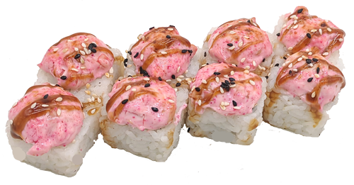 Теплый ролл. Острый ролл с крабовым сурими, помидором под фирменным соусом с мидиями, полит унаги соусом.