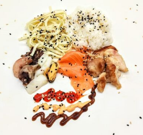 Рис, лосось, морковь, болгарский перец, огурец, кунжут, лук репчатый, имбирь и соус на выбор (Кисло-сладкий, Сливочный, Терияки, Соевый, Чили).