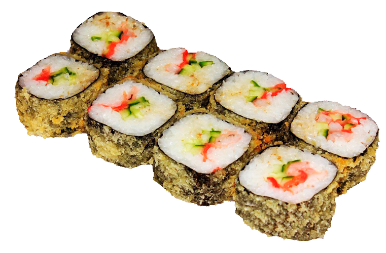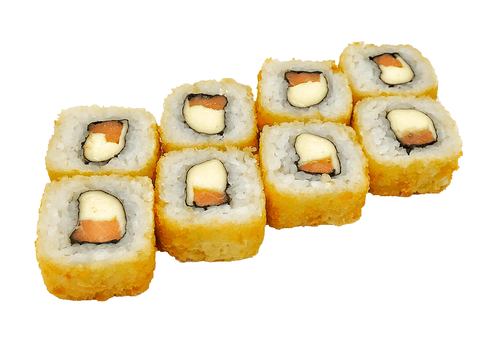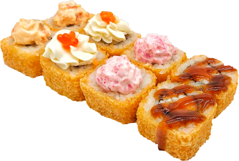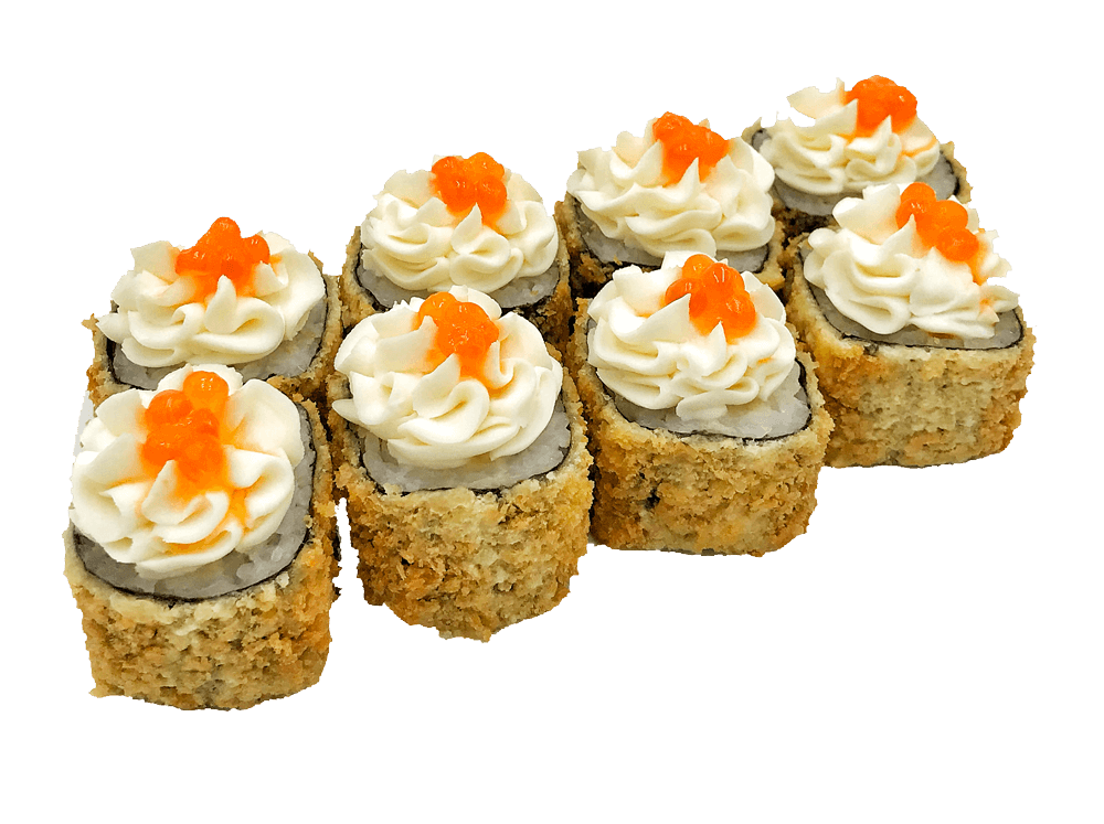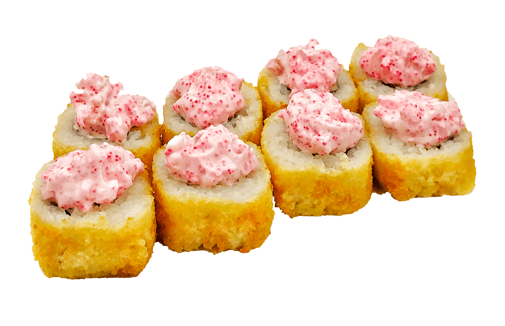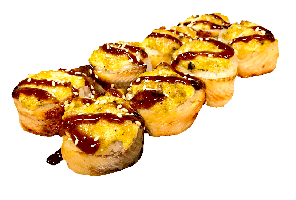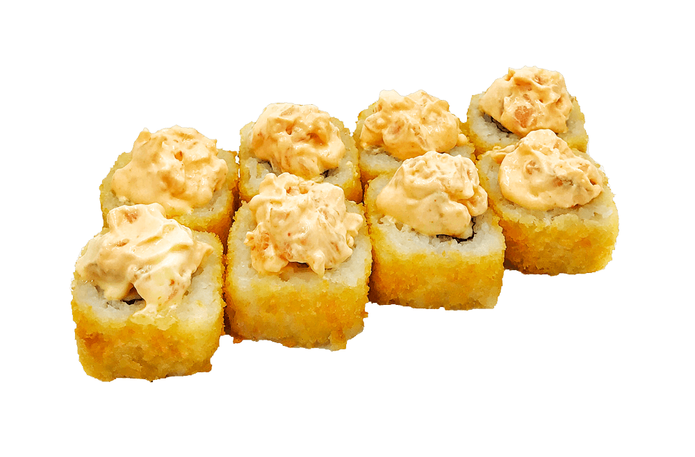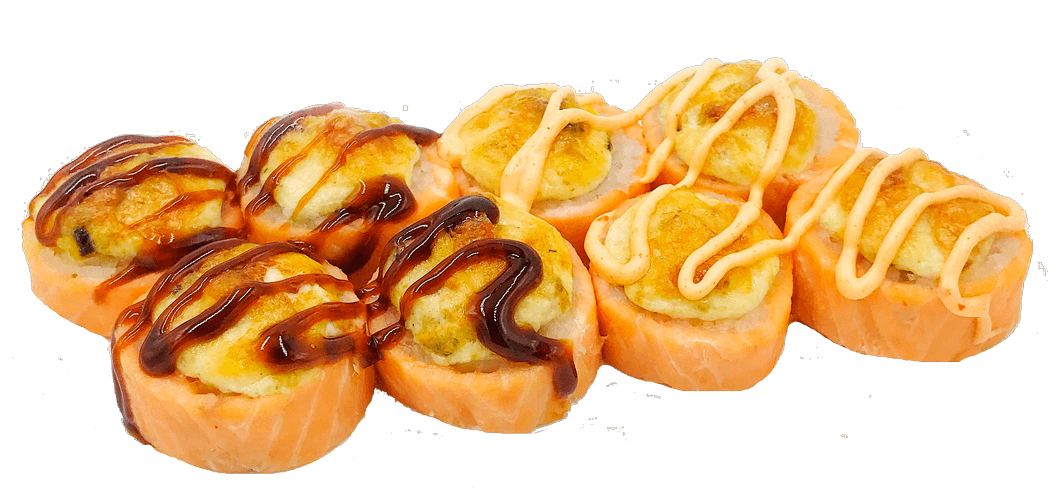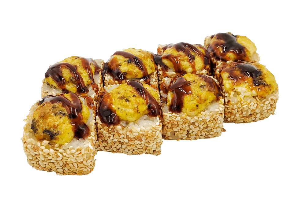 Теплый ролл. Ролл в кунжуте с копченым лососем и луком под фирменным соусом с мидиями, полит острым соусом.