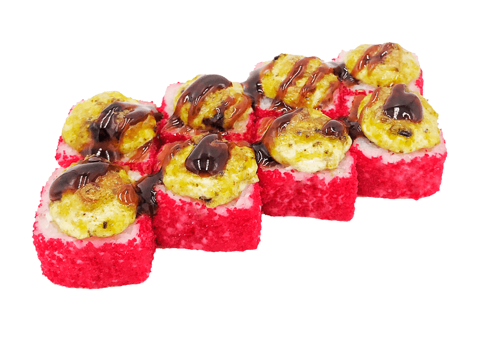 Теплый ролл. Острый ролл с крабовым сурими, помидором под фирменным соусом с мидиями, полит унаги соусом.