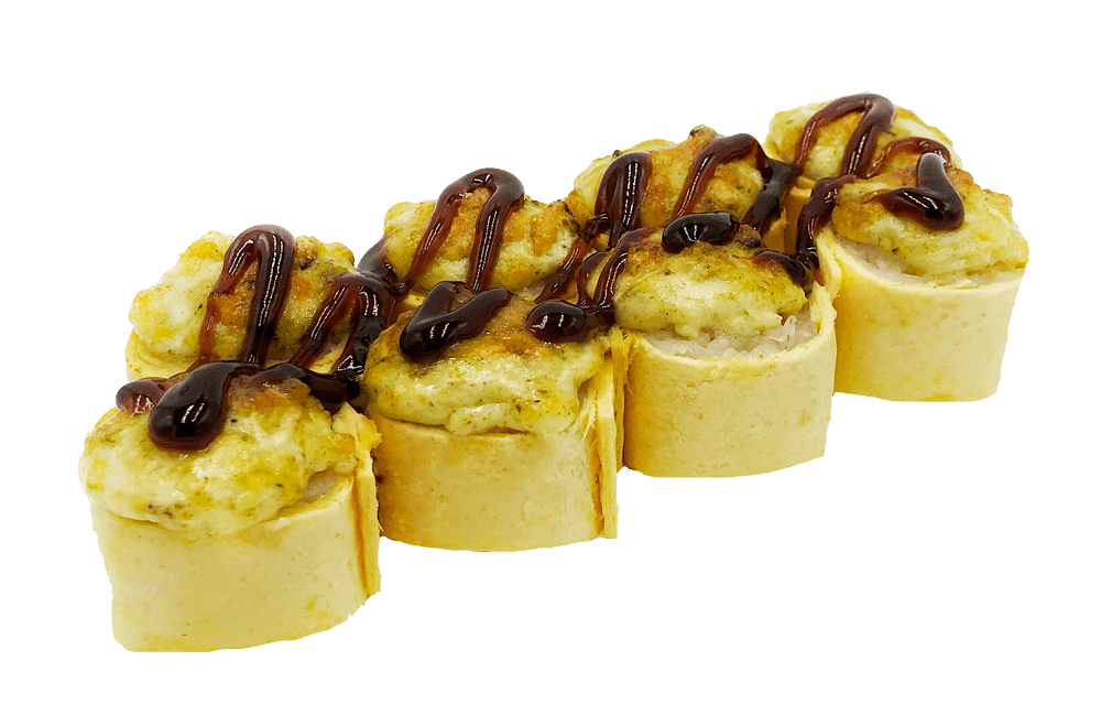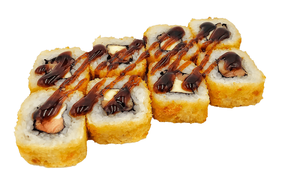 Теплый ролл. Сливочный сыр, помидор, лосось, зеленый лук, под фирменным соусом с мидиями, полит унаги соусом.