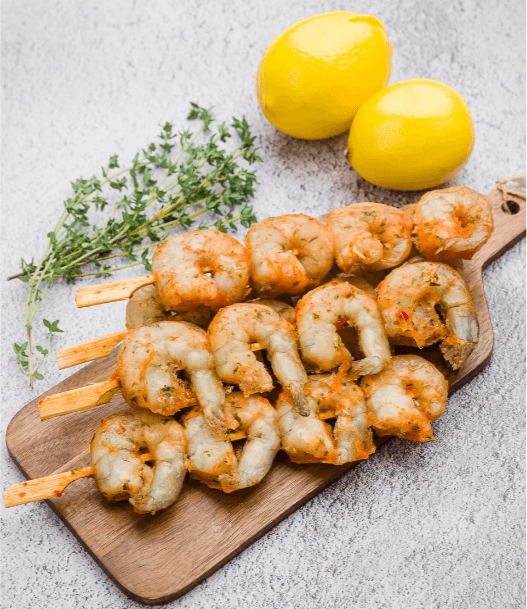 Нежнейшие королевские креветки в фирменном соусе. Цена за 1 шпажку-4 креветки.